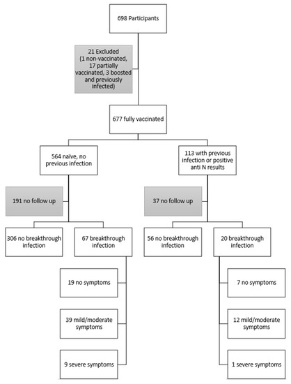 Sixty-six percent (449/677) of the fully vaccinated individuals (two-doses of a primary-series COVID-19 vaccine, or one dose of a single-dose, primary-series COVID-19 vaccine approved or authorized for use in the United States) participated in the follow-up February 2022 survey, of which, 66.1% (373/564) of participants in the infection-naïve group and 67.3% (76/113) of participants with previous infections completed the follow-up survey (Figure 1). In the follow-up survey, participants were asked if they tested positive after the blood draw; 18.0% (67/373) in the naïve group and 26.3% (20/76) in the previously infected group reported having breakthrough infections (positive Ag or PCR test). There was no significant difference in the rate of breakthrough infections between those who were infection-naïve vaccinated or previously infected and those who were vaccinated at the blood draw (p = 0.129). Among the breakthrough infections, 28.4%, 58.2%, and 13.4% (19, 39, and 9 out of 67) in the infection-naïve vaccinated group and 35.0%, 60.0% and 5.0% (7, 12, and 1 out of 20) in the previously infected and vaccinated group reported having infections with symptoms that caused no, mild/moderate, and severe limitations, respectively (Figure 1). The severity of the symptoms was based on definitions from the CDC (Vaccine Adverse Event Reporting System (VAERS), VAERS | Vaccine Safety | CDC) [18]. There was no significant difference in the severity of breakthrough infections between those who were infection-naïve and vaccinated or those who were previously infected and vaccinated at the blood draw (p = 0.552).