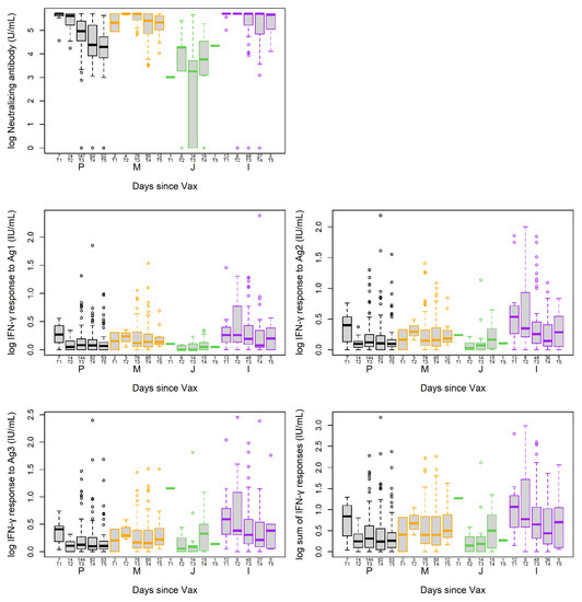 Distributions for T cell and NAb responses in participants receiving different SARS-CoV-2 vaccines. Each box shows the IQR with the median as the interior bar; the outer bars stretch out to the minimum and maximum, with the exception that points outside the fence are shown as individual circles. P: Pfizer; M: Moderna; J: Johnson & Johnson; I: previous infection or positive anti-N; T1: 0–2 months; T2: 2–4 months; T3: 4–6 months; T4: 6–8 months; T5: 8–10.5 months. Numbers indicated the time period indicators (e.g., T1–T5) are the number of participants for that group.
