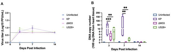 To further discern differences between the wild-type virus and the mutant viruses, the viral DNA levels were evaluated. DNA was extracted, and qPCR was conducted to determine the viral copy number within the heart. Interestingly, both ΔM33 and US28+ infections in the heart resulted in significantly lower levels of viral DNA at 3 and 7 dpi when compared with the KP-infected hearts (Figure 1B).