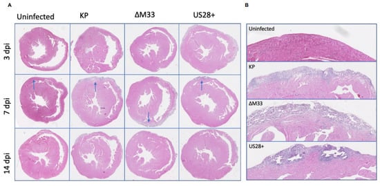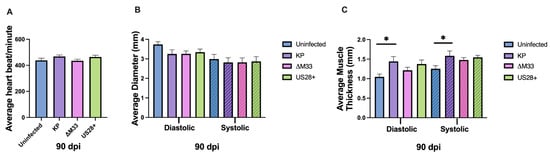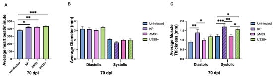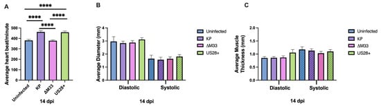 In addition to heart rate, several parameters of left ventricular function were also evaluated at 70 dpi. There were no significant differences observed for the internal diameter of the ventricle when compared together by ANOVA; however, when individually compared using the Mann–Whitney U test, the KP-infected animals exhibited a biological trend that was close to statistical significance (p = 0.053) for reduced internal diameter during systole compared with the uninfected hearts (Figure 5B). In addition, during both phases of heart beating, the KP and US28+-infected animals exhibited significantly increased posterior wall thickness (Figure 5C). Conversely, in the ∆M33-infected animals, the left ventricular posterior wall thickness was not significantly increased compared with the KP and US28+-infected mice and exhibited a similar thickness to that of the uninfected control animals. Individually, these two parameters are markers of cardiac hypertrophy and when shown together suggest exacerbated cardiac dysfunction. As the cardiac muscle expands, the posterior wall thickness increases, and this expansion can reduce the internal diameter of the ventricle, thus resulting in less-efficient hemodynamics. The significant increase in posterior wall thickness and the reduction in internal diameter observed in the KP-infected animals when compared with the uninfected controls together suggest that the dysfunction observed at 50 dpi, in our previous study, was exacerbated at 70 dpi [15]. In addition, Figure 5C suggests that M33 may contribute to the induction and exacerbation of hypertrophy within the heart.