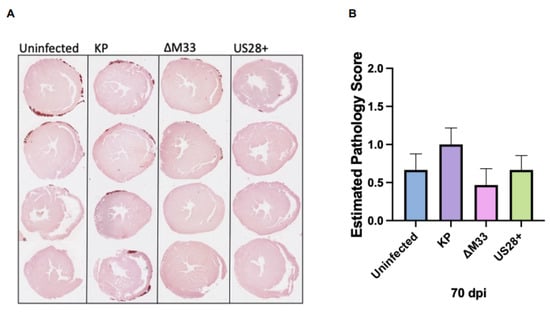 We next investigated whether vGPCRs, and M33 in particular, contribute to long-term cardiac damage and dysfunction. Therefore, mice were again uninfected or infected with 1 × 106 PFU of KP, ∆M33, or US28+ by i.p. inoculation and subsequently evaluated at 70 and 90 dpi. Similar to acute infection, at 70 dpi, there were no significant differences observed in calcification by Alizarin red staining or estimated pathology scoring (Figure 4). Uninfected BALB/c mice occasionally spontaneously develop calcification but MCMV exacerbates this phenotype [15,45]. However, at 70 dpi, we observed a biological trend approaching statistical significance (p = 0.07) when assessing the estimated pathology scores of the KP-infected hearts compared with the ∆M33-infected hearts that was not measured at 14 and 90 dpi between these groups (Figure S3). This suggests that M33 may contribute to promoting long-term calcification. At 90 dpi, the estimated pathology scores for all the infected groups were similar to those of the uninfected animals, suggesting that calcification due to MCMV infection had mostly resolved by this time point (Figure S3). Interestingly, the ∆M33-infected hearts exhibited the lowest scores among all the groups, suggesting that the trend observed at 70 dpi in the MCMV-infected animals had been maintained.