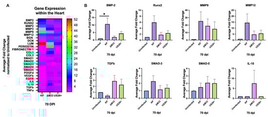 Because vGPCRs are known to alter downstream signaling, which could contribute to modulations in the tissue microenvironment, we next evaluated whether there would be differences in cellular gene expression between the virus infection groups. At 70 dpi, an RT-PCR analysis was performed with a select pool of genes known to play a role in vascular growth, collagen deposition, and extracellular matrix (ECM) remodeling, as well as cytokines that have previously been shown to be altered from CMV infection [46,47]. MCMV infection of the heart at 70 dpi resulted in the upregulation of many genes compared with the uninfected control hearts (Figure 7A). Interestingly, hearts from the KP, ∆M33, and US28+ infected mice exhibited the upregulation of genes implicated in vascular smooth muscle motility, differentiation, and calcification. Of particular importance, both bone morphogenic protein 2 (BMP2) and runt-related transcription factor 2 (RUNX2), which are markers used to determine vascular calcification, were highly upregulated in the KP-infected hearts compared with the other groups [48,49,50]. Consistent with these findings, RT-PCR conducted at 90 dpi demonstrated an upregulation in BMP2 and RUNX2 in the KP- and US28+-infected mice but not in the uninfected mice or the ∆M33-infected animals (Figure S4). This supports the biological trend observed in Figure 4 and suggests that M33 plays a role, and that US28 might also play a role, in the induction and exacerbation of calcification within the heart, as shown at the transcriptional level.