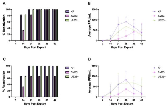Previously, we demonstrated that MCMV readily reactivates from the heart using an explant reactivation assay and we hypothesized that repeated reactivations may induce changes in the microenvironment of the heart, which over time could exacerbate cardiovascular diseases [15]. The ∆M33 virus is less efficient in reactivation from the spleen and lungs when compared with the wild-type MCMV [34]. If this deficiency also occurs within the heart, then this may contribute to the phenotypic differences between viruses shown at 70 dpi (Figure 5). In order to test this, the explant reactivation assay was conducted to examine ∆M33 and US28+ reactivation capacities within the heart. This assay allows tissues to be cultured ex vivo to evaluate their latency status and capacity for reactivation. Weekly supernatant is assessed by using a plaque assay to demonstrate reactivation. If there are no plaques at 7 days post explantation, then the tissue is considered latently infected at the time of explant. Plaques found in the following weeks (post explant) demonstrate MCMV reactivations within the explanted tissue [34].