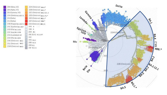 - SARS-CoV-2 Clade Naming Strategy for 2022. Available online: https://nextstrain.org/blog/2022-04-29-SARS-CoV-2-clade-naming-2022 (accessed on 23 January 2023).