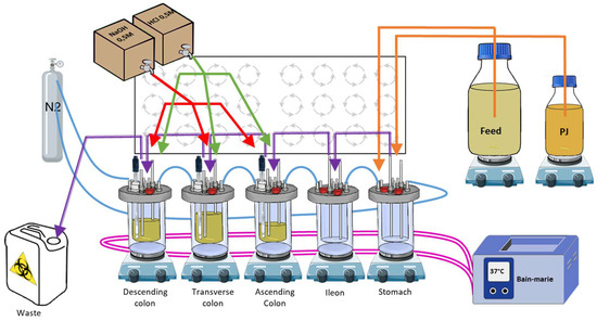 - Minekus, M.; Smeets-Peeters, M.; Havenaar, R.; Bernalier, A.; Fonty, G.; Marol-Bonnin, S.; Alric, M.; Marteau, P.; Huis In’t Veld, J.H.J. A computer-controlled system to simulate conditions of the large intestine with peristaltic mixing, water absorption and absorption of fermentation products. Appl. Microbiol. Biotechnol. 1999, 53, 108–114. [Google Scholar] [CrossRef]