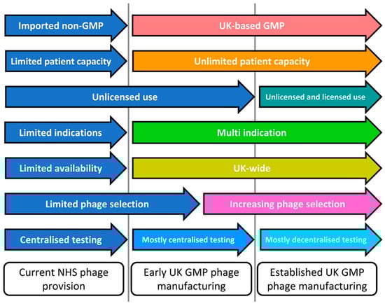 Currently, unlicensed medicines policies (sometimes termed non-formulary requests) can support clinicians wanting to access phage therapy for patients whose clinical needs cannot be met by antibiotics. However, sourcing high-quality phages is challenging, especially for those unfamiliar with phages. Access to phages is currently on an ad hoc basis and driven largely by networking between clinicians and clinical phage laboratories. This means that access to phage therapy is not currently equitable, with large variations in clinician awareness and NHS capacity to deliver phages as an unlicensed medicine across the UK. There have been some international initiatives to “join up” clinical demand with collections of phages. For example, Phage Directory has successfully connected clinicians seeking phages to groups with appropriate phages []. However, fundamentally, these disparate sources are not sustainable, scalable, or of a consistent quality. Phages can be contract manufactured according to GMP, but at a cost of over GBP 500,000 for phages sufficient for a few hundred patients, this is also not sustainable or scalable. The provision of phage therapy in the UK will not progress beyond an increasing number of ad hoc cases until an onshore sustainable and scalable source of GMP phages is established. Sustainable and scalable access to GMP phages is similarly curtailing the expansion of phage therapy in other countries. Notably, in countries where phage therapy has progressed, clinically and/or commercially, this has typically been underpinned in some form by public funding. We hope that the UK Government and ongoing Parliamentary Science and Technology Select Committee Inquiry will recognise the potential of public funding to simultaneously transform the clinical, research, and commercial phage therapy landscapes in the UK. Access to well-characterised GMP phages would facilitate multiple phage therapy clinical trials in the UK and catalyse UK phage businesses. We therefore outline in the following sections how we are actively working to deliver a well-characterised, sustainable, equitable, and scalable source of GMP phages that will transform the way we treat infection in the UK.