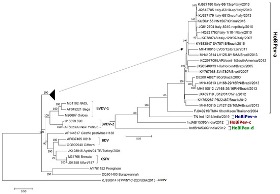 - Mishra, N.; Rajukumar, K.; Pateriya, A.; Kumar, M.; Dubey, P.; Behera, S.P.; Verma, A.; Bhardwaj, P.; Kulkarni, D.D.; Vijaykrishna, D.; et al. Identification and molecular characterization of novel and divergent HoBi-like pestiviruses from naturally infected cattle in India. Vet. Microbiol. 2014, 174, 239–246. [Google Scholar] [CrossRef]