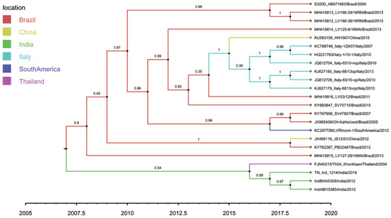 - Suchard, M.A.; Lemey, P.; Baele, G.; Ayres, D.L.; Drummond, A.J.; Rambaut, A. Bayesian phylogenetic and phylodynamic data integration using BEAST 1.10. Virus Evol. 2018, 4, vey016. [Google Scholar] [CrossRef]