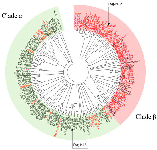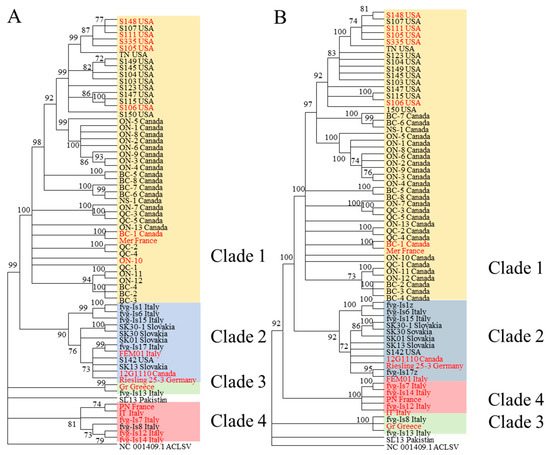 - Tarquini, G.; De Amicis, F.; Martini, M.; Ermacora, P.; Loi, N.; Musetti, R.; Bianchi, G.L.; Firrao, G. Analysis of New Grapevine Pinot Gris Virus (GPGV) Isolates from Northeast Italy Provides Clues to Track the Evolution of a Newly Emerging Clade. Arch. Virol. 2019, 164, 1655–1660. [Google Scholar] [CrossRef] [PubMed]