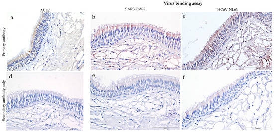 Human trachea sections stained for ACE2 showed predominant expression on the epithelial cells, particularly towards the tracheal epithelial lining (Figure 1a). However, ACE2 expression was not observed in the subepithelial region of the trachea. Virus binding assay on human tracheal sections incubated overnight with heat-inactivated SARS-CoV-2 (USA-WA1/2020) and HCoV-NL63 revealed virus attachment. Both SARS-CoV-2 and HCoV-NL63 bound on the trachea’s epithelial and subepithelial regions (Figure 1b,c). Meanwhile, the respective secondary antibody controls showed minimal background staining (Figure 1d–f). Despite intrinsic limitations of the IHC technique, background staining was minimized by adjusting different parameters, i.e., antibody concentrations, hydrogen peroxide concentrations, and incubation times with the DAB substrate. In addition, residual specific or non-specific binding of the virus to other cellular receptors in the sub-epithelial region should be considered.
