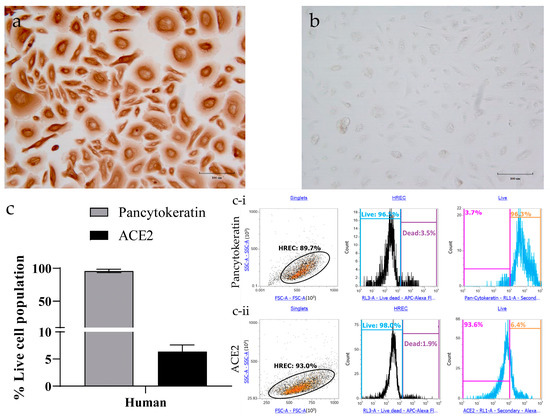 Epithelial cell-specific staining of HRECs showed evident expression of pan-cytokeratin (Figure 2a), while the corresponding secondary antibody controls had a minimal background (Figure 2b). Quantification analysis by flow cytometry further confirms that all the cells expressed pan-cytokeratin, but only 6% of these cells expressed ACE2 (Figure 2c).