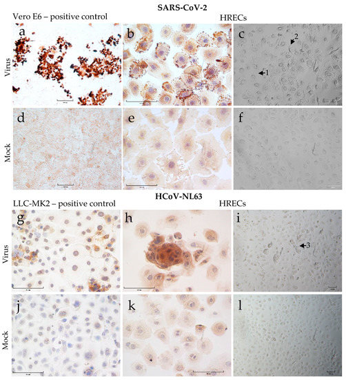 Cytopathic effect (CPE) and detection of viral nucleoprotein (SARS-CoV-2 or HCoV-NL63) in human respiratory epithelial cells (HRECs) and the Vero E6 and LLC-MK2 cell lines used to propagate SARS-CoV-2 and HCoV-NL63. Cells fixed in 4% paraformaldehyde were stained with ImmPRESS VR anti-mouse/rabbit IgG horseradish peroxidase (HRP) polymer detection kit. Anti-SARS Coronavirus/SARS-Related Coronavirus 2 nucleocapsid (N) protein (0.75 μg/mL), and anti-HCoV-NL63 nucleocapsid (N) protein monoclonal antibody (0.25 µg/mL) were used to detect corresponding viruses. Dark brown indicates the presence of a viral protein that interacts with a specific antibody, which is considered a positive expression; pale brown denoted background straining, and the nucleus was counterstained blue with hematoxylin. (a) Vero-E6 cells after 72 h post-inoculation (hpi) with SARS-CoV-2 as positive control; (b) HRECs after 72 hpi with SARS-CoV-2; (c) HRECs showing CPE after 120 hpi with SARS-CoV-2 (1—dying cells, 2—rounding of cells); (g) LLC-MK2 cells after 120 hpi with HCoV-NL63; (h) HRECs after 120 hpi with HCoV-NL63. (i) HRECs showing CPE after 120 hpi with HCoV-NL63 (3—cells mostly healthy looking but with syncytia formation); (d–f,j–l) Respective mock inoculations with culture medium. Scale bar—100 μm.