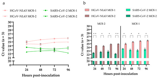 To evaluate the differences in viral replication kinetics between SARS-CoV-2 and HCoV-NL63 in HRECs, supernatants from three replicates were collected at different time points (24, 48, 72, 96, 120 hpi) from each inoculated viral dose and evaluated using N gene-based RT-qPCR assays. No significant differences in Ct values were observed during infection, either in SARS-CoV-2 or in HCoV-NL63. The Ct values of MOI-1 were higher than MOI-2 in HRECs inoculated with HCoV-NL63 and SARS-CoV-2 (Figure 4a). However, when compared between the viruses, i.e., HCoV-NL63 and SARS-CoV-2, a statistically significant difference (p < 0.05) was observed in Ct values at both MOI-2 and -1 (Figure 4b). Ct values of SARS-CoV-2 were comparatively lower than HCoV-NL63 across all the time points tested, resulting in more significant viral replication of SARS-CoV-2 in HRECs.