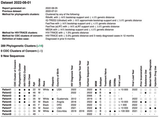 - Centers for Disease Control and Prevention. Detecting and Responding to HIV Transmission Clusters: A Guide for Health Departments. 2018. Available online: https://www.cdc.gov/hiv/pdf/funding/announcements/ps18-1802/CDC-HIV-PS18-1802-AttachmentE-Detecting-Investigating-and-Responding-to-HIV-Transmission-Clusters.pdf (accessed on 30 June 2022).