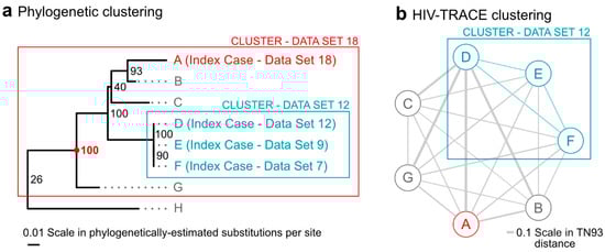 Title: A growing cluster with differential detection between phylogenetic and distance-only methods. Legend: The figure shows a comparison between a phylogenetic cluster (panel (a)) and a HIV-TRACE cluster graph (panel (b)) for those same cases. The 100% bootstrap supported (red 100) cluster in panel a (red box) contains a new index case from dataset 18 (A, red); three prior index cases from datasets 7, 9, and 12 (D–F, blue), which formed a cluster in the analysis of dataset 12 by both phylogenetic methods and HIV-TRACE at the 0.5% threshold; and previously un-clustered cases B, C, and G. Panel (a) also shows the nearest non-clustered case (H). The HIV-TRACE distance-based cluster graph in panel (b) of the same cases demonstrates that only cases D, E, and F remain part of the cluster in dataset 18 (blue edges). Cases A, B, C, and G are not clustered by HIV-TRACE as their pairwise distances (gray edges) are larger than distance thresholds established by the Centers for Disease Control and Prevention (CDC). Notes: Branch lengths in (a) are scaled by the estimated substitutions per site in the phylogeny, while edge thicknesses in (b) are scaled by the TN93 pairwise genetic distance calculated by HIV-TRACE. Phylogenetic bootstrap support (out of 100 bootstrap replicates) is shown in small text next to splits in the tree in (a) and the split with bootstrap support of 100 that defines the cluster is highlighted with a red dot.