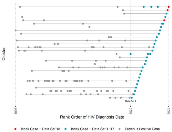 Lastly, the pipeline generates a visual summary of the evolving HIV molecular cluster membership in RI across monthly reporting (Figure 3; in the actual reports the X axis denotes exact diagnosis dates). Each horizontal line represents a cluster throughout its lifespan and dots represent individual members by their HIV-1 diagnosis date. Red dots represent current index cases that were individually discussed in the 18th (most recent) case management meeting. Blue dots represent index cases from prior months, allowing for visual exploration of cluster growth. Clusters containing both red and blue dots are of special concern since they may indicate active cluster growth, informing discussions and the urgency of public health intervention.