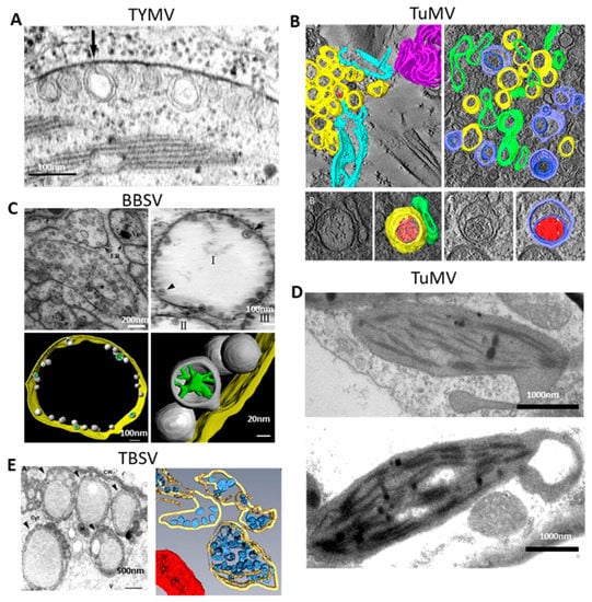 Upon infection, plant viruses preferentially target and remodel specific membranous organelles, such as the ER, peroxisomes, mitochondria, chloroplasts, and/or tonoplasts for the formation of VROs. In addition to the origin of membranes, the shape and size of VROs may also vary from virus to virus. Some viruses may not have strict requirements for a particular type of membrane source, as they can change to alternative organelles for replication [42,43,44]. The newly advanced electron tomography and light microscopy techniques provide more details on the architecture of VROs [45,46,47]. Along with substantial advances in the ultrastructure of the membrane-bound viral replication compartments, recent results have shed light on the role that viral and host factors play in rearranging these membranes.