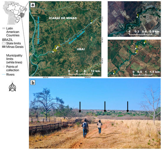 Location of the study area in the neighboring municipalities of Icaraí de Minas and Ubaí, in the northern part of Minas Gerais. (a) Satellite pictures showing mosquito sampling points (1 to 5) along the “Riacho Grande” river bordered by a narrow riparian forest surrounded by a highly fragmented landscape, composed of pastures and plantations. (b) The arid landscape where the study was conducted. The black arrows show that the only green area was the riparian forest where mosquitoes were sampled.