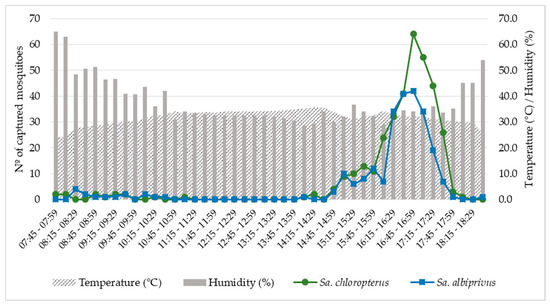 Sa. chloropterus and Sa. albiprivus exhibited a strong peak of biting activity at the end of the day, from 4:00 p.m. to 5:45 p.m., with a greater number of adults captured from 4:45 p.m. to 4:59 p.m., coinciding with trends of slightly increasing relative humidity (from 30 to 35%) and declining temperature (from 34 °C to 30 °C). Few individuals were captured during the morning (n = 28) or during twilight (n = 6) (Figure 2; Supplementary Material S1).