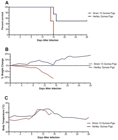 Comparison of clinical progression of a clade III Lassa virus isolate in strain 13 and Hartley guinea pigs. In an initial assessment of virulence, 6 strain 13 and 8 Hartley guinea pigs were inoculated with 1 × 105 median tissue culture infectious doses of a p1 clinical LASV isolate and observed daily for signs of disease. Shown are percent survival curves (A), average percent weight change (B), and average body temperatures (C).