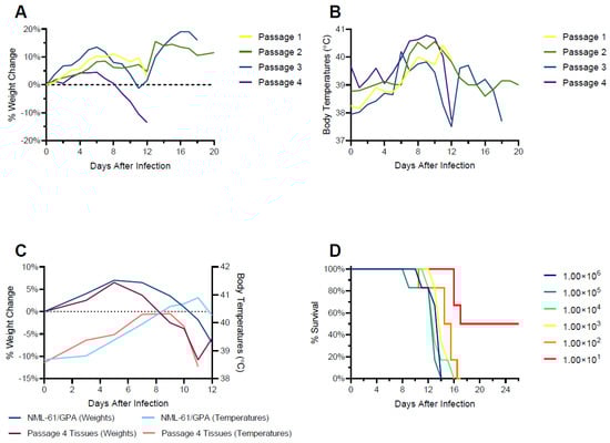 Guinea pig adaption of a clade III Nigerian Lassa virus isolate. Groups of 4 Hartley guinea pigs were infected with 1 × 105 median tissue culture infectious doses of a primary isolate of a clade III Lassa virus isolate propagated on Vero E6 cells (passage 1) or 10% weight by volume pooled tissue homogenates collected from clinically ill or moribund animals from the previous passage (passages 2–4). Shown are percent weight change (A) and average body temperatures (B) observed post-inoculation per passage. (C) Comparison of weight change and body temperatures from 6 guinea pigs inoculated with passage 4 tissues or a cell culture isolate (NML-61/GPA) derived from passage 4 tissues. (D) Determination of the median lethal dose of guinea pigs inoculated with a cell culture derived, guinea pig adapted clade III Lassa virus.