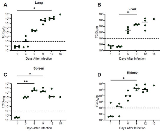 Temporal analysis of infectious viral loads from guinea pigs infected with NML-61/GPA. Twenty-four guinea pigs were inoculated with 100LD50 of NML-61/GPA. Groups of four animals were euthanized at indicated days post-inoculation and Lung (A) Liver (B) Kidney (C) and Spleen (D) samples collected and analyzed by standard cell culture techniques for the presence of infectious Lassa virus. Dots represent individual animal values, bar represents group averages. Dashed line represents the lower limit of confidence in the infectious assay. Significant differences where p < 0.05 and <0.01 are indicated by * and **, respectively.