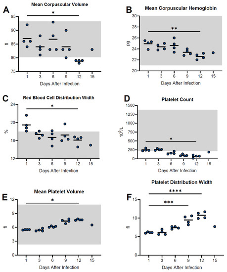 Temporal analysis of hematological values from guinea pigs infected with NML-61/GPA. Twenty-four guinea pigs were inoculated with 100LD50 of NML-61/GPA. Groups of four animals were euthanized at indicated days post-inoculation and analyzed for hematological abnormalities. Shown are data for mean corpuscular volume (A), mean corpuscular hemoglobin (B), red blood cell distribution width (C), platelet count (D), mean platelet volume (E), and platelet distribution width (F). Dots represent individual animal values; bar represents group averages. Where available, normal ranges are indicated by gray shading (www.criver.com, accessed 8 March 2023). Significant differences where p < 0.05, <0.01, <0.001, and <0.0001 are indicated by *, **, ***, and **** respectively.