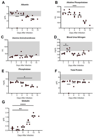 Temporal analysis of serum biochemistries from guinea pigs infected with NML-61/GPA. Twenty-four guinea pigs were inoculated with 100LD50 of NML-61/GPA. Groups of four animals were euthanized at indicated days post-inoculation and analyzed for biochemical abnormalities. Shown are data for albumin (A), alkaline phosphatase (B), alanine aminotransferase (C), blood urea nitrogen (D), phosphataI (E), total protein (F), and globulin (G). Dots represent individual animal values, bar represents group averages. Where available, normal ranges are indicated by gray shading (www.criver.com, accessed 8 March 2023). Significant differences where p < 0.05, <0.01, <0.001, and <0.0001 are indicated by *, **, ***, and **** respectively.