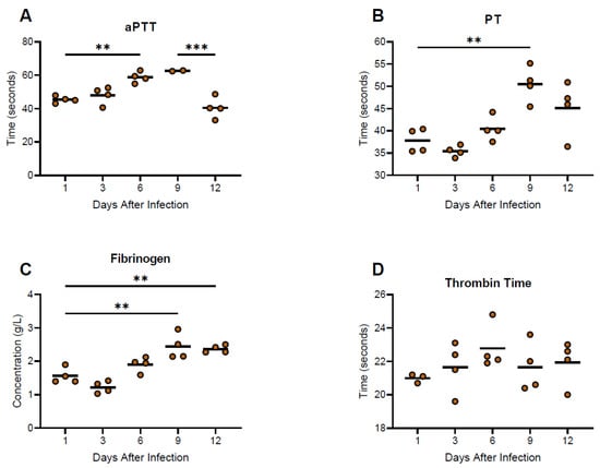 Coagulation profiles from guinea pigs infected with NML-61/GPA. Twenty-four guinea pigs were inoculated with 100LD50 of NML-61/GPA. Groups of four animals were euthanized at indicated days post-inoculation and analyzed for aPPT (A), PT (B), Fibrinogen (C), and Thrombin time (D). Dots represent individual animal values; bar represents group averages. Significant differences where p < 0.01, and <0.001, are indicated by **, and ***, respectively.