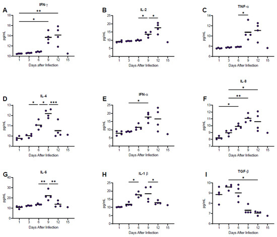 Serum concentrations of nine cytokines (IFN gamma, INF alpha, TNF alpha, TGF beta 1, IL-2, IL-4, IL-6, IL-8, and IL-1 beta) were monitored in samples collected during the temporal kinetics study. Samples were gamma irradiated (5 MRad from a Cobalt-60 source) and run in duplicate on specific enzyme-linked immunosorbent assays according to the manufacturer’s specifications (Abclonal, Woburn, MA, USA).