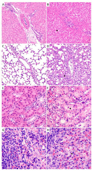Liver specimens collected at days 1 and 3 post-infection were largely unremarkable. Early histopathological abnormalities consisted of minimal necrosis with occasional hepatocellular dropout noted in animals euthanized at day 6. Minimal necrosis remained present in animals sampled at days 9 (two of four guinea pigs) and 12 (three of four) with slight, focal, mostly portal hepatitis observed in two animals examined at day 9 and all animals at day 12 (minimal-to-mild). Signs of steatosis were largely absent in animals euthanized before day 9 post-infection. By day 12 post-infection, three of four animals displayed significant and diffuse steatosis ranging from mild to moderate-to-severe (Figure 8).