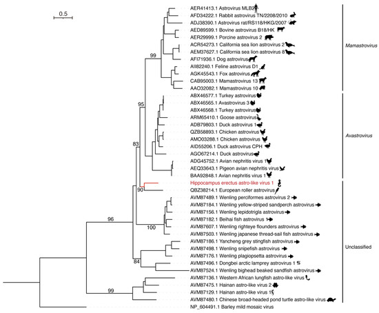 Phylogenetic analysis of the RdRp sequences of Hippocampus erectus astro-like virus 1 (HeAstV1) and representative astroviruses. The reference sequences were downloaded from GenBank and aligned using Mafft. Phylogenetic analysis was conducted using IQ-TREE, with the best-fit model LG + I + G4 and 1000 bootstrap replicates. Only bootstrap values > 80% are shown.