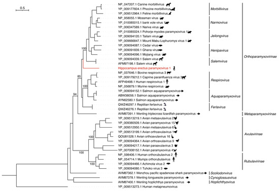 Although HePmV1 showed approximately 45.55% aa identity in the RdRp to Salem virus (NC_025386.1) from the genus Salemvirus, family Orthoparamyxovirinae (Figure 3), HePmV1 did not fall within the genus Salemvirus. Alternatively, it formed a separate branch, representing a new member of the subfamily Orthoparamyxovirinae.