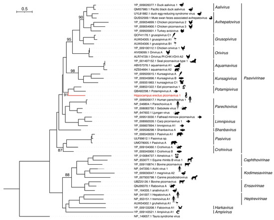 Phylogenetic analysis of the RNA-dependent RNA polymerase (RdRp) sequences of Hippocampus erectus picornavirus 1 (HePcV1). Phylogenetic analysis was performed using IQ-TREE, with the best-fit model LG + I + G4 and 1000 bootstrap replicates. Only bootstrap values > 80% were shown.