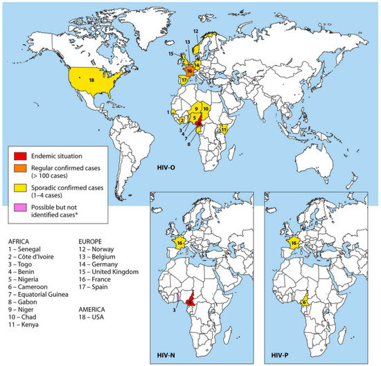 HIV-1/O infection is also sporadic outside Western Central Africa and has been reported in West and East Africa [43,44,45,46,47,48], the United States and Europe [4,49,50,51,52,53] but always connected to patients or partners of patients originating in Cameroon (Figure 2). The RES-O (a French network) has been set up by the National Reference Center of HIV in France, with the aim of monitoring the spread of these variants and characterizing them. Since the first case described in 1992, one hundred forty-four HIV-1/O-infected patients have been described [54,55]. Moreover, two cases of HIV-1/M + O dual infection and several HIV-1/MO recombinants have also been detected outside Western Central Africa since 2004 and 2010, respectively. To date, 5 and 12 cases of HIV-1/M + O dual infections and of HIV-1/M + O recombinant forms, respectively, have been described, in several studies, all in France [56,57,58,59,60]. All these cases were identified in patients with an epidemiological link with Cameroon. Overall, since the description of the first case in 1999 in Cameroon, 25 HIV-1/MO recombinants have been identified in 24 patients, grouped into 20 URF_MO [61] (NRC data, manuscript in preparation).