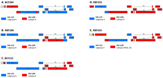 - Yamaguchi, J.; Bodelle, P.; Vallari, A.S.; Coffey, R.; McArthur, C.P.; Schochetman, G.; Devare, S.G.; Brennan, C.A. HIV infections in northwestern Cameroon: Identification of HIV type 1 group O and dual HIV type 1 group M and group O infections. AIDS Res. Hum. Retrovir. 2004, 20, 944–957. [Google Scholar] [CrossRef] [PubMed]