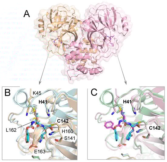 - Ho, C.Y.; Yu, J.X.; Wang, Y.C.; Lin, Y.C.; Chiu, Y.F.; Gao, J.Y.; Lai, S.J.; Chen, M.J.; Huang, W.C.; Tien, N.; et al. A Structural Comparison of SARS-CoV-2 Main Protease and Animal Coronaviral Main Protease Reveals Species-Specific Ligand Binding and Dimerization Mechanism. Int. J. Mol. Sci. 2022, 23, 5669. [Google Scholar] [CrossRef]