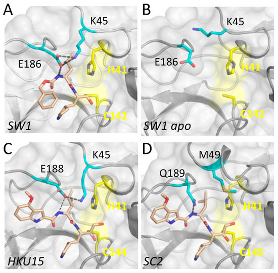 For GC376, the interactions of the inhibitor with the active site residues of SW1 Mpro depended on the binding mode, as expected. In protomer A, where the P3 moiety bound in the same conformation as in SARS-CoV-2 Mpro, interactions with L162 were less extensive compared to the equivalent M165 (Figure 2A,B) while the leucine group of GC376 had considerably higher contacts with Glu186 of SW1 Mpro, compared to Gln189 at the equivalent location in SARS-CoV-2 (Figure 2A,B). These interactions were even more pronounced in protomer B where the P3 ring flipped to orient closer to Glu186. Thus, for both inhibitors, PF-00835231 and GC376, the leucine-like P2 moiety had extensive interactions with the Glu186/188. The 180s loop containing this Glu/Gln amino acid varies in conformation, depending on the bound ligand (substrate peptide or inhibitor) in crystal structures reported [28]. Thus, the flexibility and variation in this loop might be relevant for accommodating different inhibitors.
