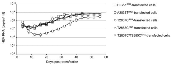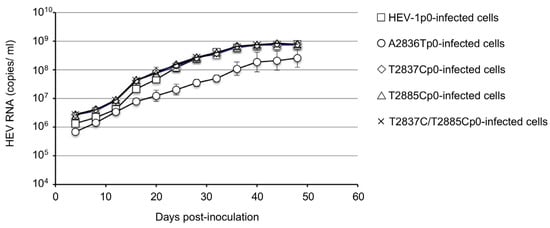 For a confirmation of the infectivity of HEV-1p0, A2836Tp0, T2837Cp0, T2885Cp0, and T2837C/T2885Cp0, the culture supernatant was collected on day 52 p.t., and the virus RNA titer was adjusted to 1 × 108 copies/mL and used to inoculate PLC/PRF/5 cells. Triplicate samples were used for inoculation. The virus RNA titers on day 4 post-infection (p.i.) in the HEV-1p0-, T2837Cp0-, T2885Cp0-, and T2837C/T2885Cp0-inoculated cell culture supernatants were 1.37 × 106, 2.80 × 106, 2.61 × 106, and 2.63 × 106 copies/mL, respectively. These viral RNAs then increased in a similar pattern and reached >108 copies/mL on day 24 p.i.; by day 40 p.i., the viral RNAs reached peaks at 7.22 × 108 to 7.56 × 108 copies/mL in the HEV-1p0-, T2837Cp0-, T2885Cp0- and T2837C/T2885Cp0-inoculated cells.