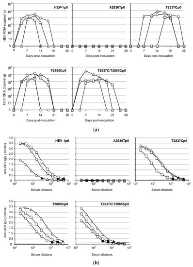 For the investigation of the infectivity of the ORF4-defective viruses in vivo, HEV-1p0, A2836Tp0, T2837Cp0, T2885Cp0, and T2837C/T2885Cp0 containing 1.0 × 108 copies/mL of the virus RNA were intraperitoneally inoculated into Mongolian gerbils as described in the Materials and Methods. The virus RNA in the fecal specimens was monitored by RT-qPCR. As shown in Figure 4a, the virus RNAs were detected in all of the fecal specimens from the HEV-1p0-, T2837Cp0-, T2885Cp0-, and T2837C/T2885Cp0-inoculated gerbils, although the detectable periods differed. The virus RNAs reached peaks around day 14 p.i. and the titers ranged from 1.4 × 104 to 3.2 × 104 copies/g in the HEV-1p0-inoculated gerbils, from 1.1 × 104 to 8.5 × 104 copies/g in the T2837Cp0-inoculated gerbils, from 2.4 × 104 to 1.4 × 105 copies/g in the T2885Cp0-inoculated gerbils, and from 1.6 × 104 to 9.3 × 104 copies/g in the HEV- T2837C/T2885Cp0-inoculated gerbils. The virus RNA titers then decreased and became undetectable in all of the HEV-inoculated gerbils on day 28 p.i. In contrast, no virus RNA was detected in the three A2836Tp0-inoculated gerbils (Figure 4a).