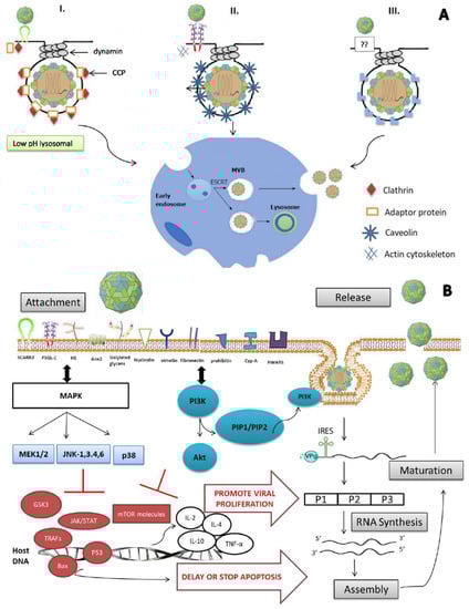 Most viruses use endocytosis, a cellular process in which extracellular substances are taken into the cytoplasm through membrane-bound vesicles such as endosomes or lysosomes. EV-A71 has been identified to use this process within multiple routes depending on the cell surface receptors/co-receptors []. Indeed, EV-A71 enters cells through receptor-mediated endocytosis: clathrin using a “clathrin-coated pit” (CCP) and caveolae and endophilin A2, both in the presence of dynamin and the actin cytoskeleton. The processes differ according to the type of receptor. However, once the virus is internalized, the translocation into the cytoplasm is the same, occurring via the endosomal sorting complex required for transport to multivesicular bodies (ESCRT-MVBs). Overall, three different mechanisms are involved in the process of viral entry (depicted in detail in Figure 1A).