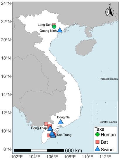We are thankful to the government of Viet Nam for supporting this multi-sector One Health surveillance study. We would like to acknowledge the hard work and dedication of provincial animal health and public health officers and the Wildlife Conservation Society health team for conducting field sampling, partnering laboratories for running diagnostic tests, and many other agencies for collaborations on this project. Specifically, we would like to acknowledge the community around the Tan Lap natural bat cave located in Lang Son province, Vo Be Hien (Dong Thap Sub-Department of Animal Health); Quach Van Tay (Soc Trang Sub-Department of Animal Health); Bach Duc Luu (Regional Animal Health Office No. 6), Nguyen Ngoc Tien (Aquatic Diseases Division, Department of Animal Health); Nguyen Dang Tho (National Center for Veterinary Diagnostics, Department of Animal Health); Maho (Imanishi) Urabe, Nguyen Thi Phuc, Do Thi Hong Hien, and Satoko Otsu (WHO Viet Nam); Nguyen Thi Minh Thoa and Philip Gould (USCDC); Laura MacFarland-Berry and Leopold Loth (FAO Viet Nam); Dang Duc Anh and Tran Nhu Duong (National Institute of Hygiene and Epidemiology). We would also like to thank Diego Montecino-Latorre for his contribution in producing the map of sampling locations included in this publication.