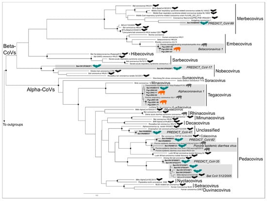 For sequence analysis and virus classification, operating taxonomic units were defined with a cut off of 90% sequence identity, i.e., groups sharing ≥ 90% identity to a sequence already in GenBank were given the same name as the matching sequence and virus sequences that shared less than 90% identity to a known sequence were labeled sequentially as PREDICT_CoV/PmV-1, -2, -3, etc. [44]. Subsets of sequences representing either the whole CoV or PmV diversity detected in our samples were selected for our phylogenetic analysis. Representatives of all CoV and PmV species infecting mammals or birds and currently recognized by the ICTV were also included in the dataset (Tables S3 and S4). Sequences of porcine deltacoronavirus (GenBank accession numbers KP757891 and MK993519) and Sunshine virus (GenBank accession number JN192445) were used as outgroups in our CoV and PmV phylogenetic trees, respectively.