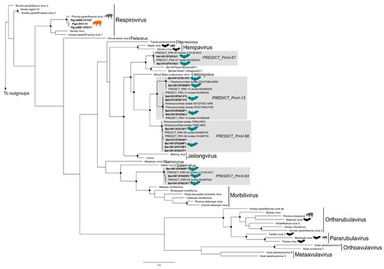 Internal nodes of our PmV phylogenetic tree were poorly supported but all PmV subgenera currently recognized by the ICTV, except the Orthorubulavirus subgenus, formed well-supported monophyletic lineages in the tree (Figure 3). Only one PmV, the porcine parainfluenza virus 1 belonging to the Respirovirus subgenus, was detected in our pig samples from Viet Nam while four distinct PmV taxonomic units, all corresponding to novel viruses, were identified in our bat samples (Table 1 and Figure 3). These four PmVs were only detected in samples collected in southern Viet Nam (Soc Trang and Dong Thap provinces). PREDICT_PmV-63 is closely related to the Morbilivirus subgenus, which includes Measles, Rinderpest and Peste-des-petits-ruminants viruses (Figure 3). The other bat PmVs identified in this study, PREDICT_PmV-13, PREDICT_PmV-66, and PREDICT_PmV-67, are closely related to viruses belonging to the Jeilongvirus subgenus (Figure 3). None of the bat PmVs identified in this study are phylogenetically related to PmVs known to cause significant diseases in pigs.