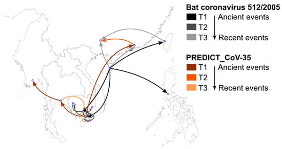 Spatiotemporal dispersal of bat coronavirus 512/2005 (grey shades) and PREDICT_CoV-35 (brown shades) in Southeast Asia inferred from a fragment of the RdRp gene (386 bp, [36]). Arrows indicate the direction of dispersal routes. Darker arrow colors indicate older dispersal events for both viruses.