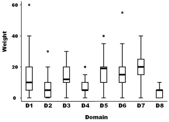 The median of the weights of domains D2, D4, and D8 was significantly lower than the median of domain D1 as a reference (median regression; p-value = 0.019). The median of the weights of domains D5 and D7 was significantly higher than the median of domain D1 as a reference (median regression; p-value < 0.001).