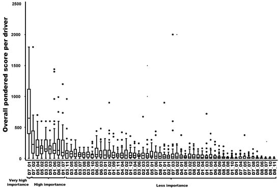 To obtain the overall score per driver, an aggregation method that combined the two types of weighting (i.e., intra- and inter-domain) was used. First, the driver score (coefficients attributed by experts) was standardized by dividing it by the number of possibilities. Indeed, some drivers were allotted coefficients from 0 to 4 (5 possibilities) and others from 1 to 4 (4 possibilities). Afterwards, this standardized score was multiplied by the intra-domain weight and the inter-domain weight, as given by the expert. These results led to an overall weighted score for each driver and per expert: