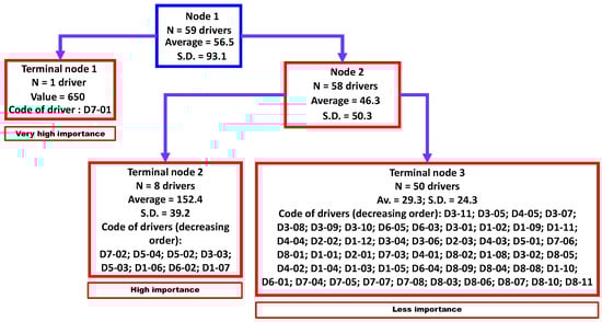 Three clusters were identified by regression tree analysis (Figure 3) that were significantly different (non-parametric Kruskal-Wallis equality-of-populations rank test; chi-squared test = 22.6 with two degrees of freedom (d.f.) and α = 0.05; p-value = 0.0001). These three clusters were classified as “very high importance” (N = 1 driver), “high importance” (N = 8 drivers), and “less importance” (N = 50 drivers).