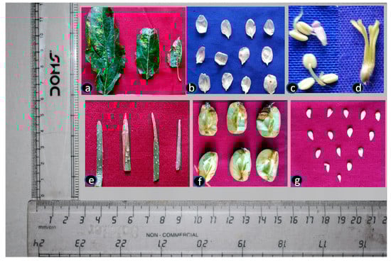 Different plant parts/tissues with presence or absence of symptoms noted for virus detection and quantification. (a) Symptomatic leaf and pedicel, (b) petals, (c) anther, (d) flowers without petal, (e) bark, (f) fruit and (g) seed.