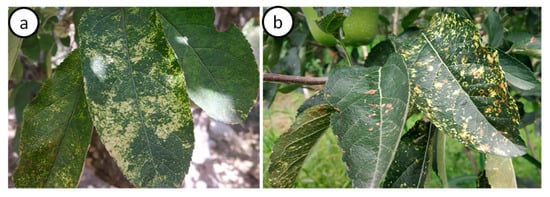 The symptoms of mosaic and necrotic mosaic on two cultivars: Golden Delicious (a) and Oregon Spur (b).